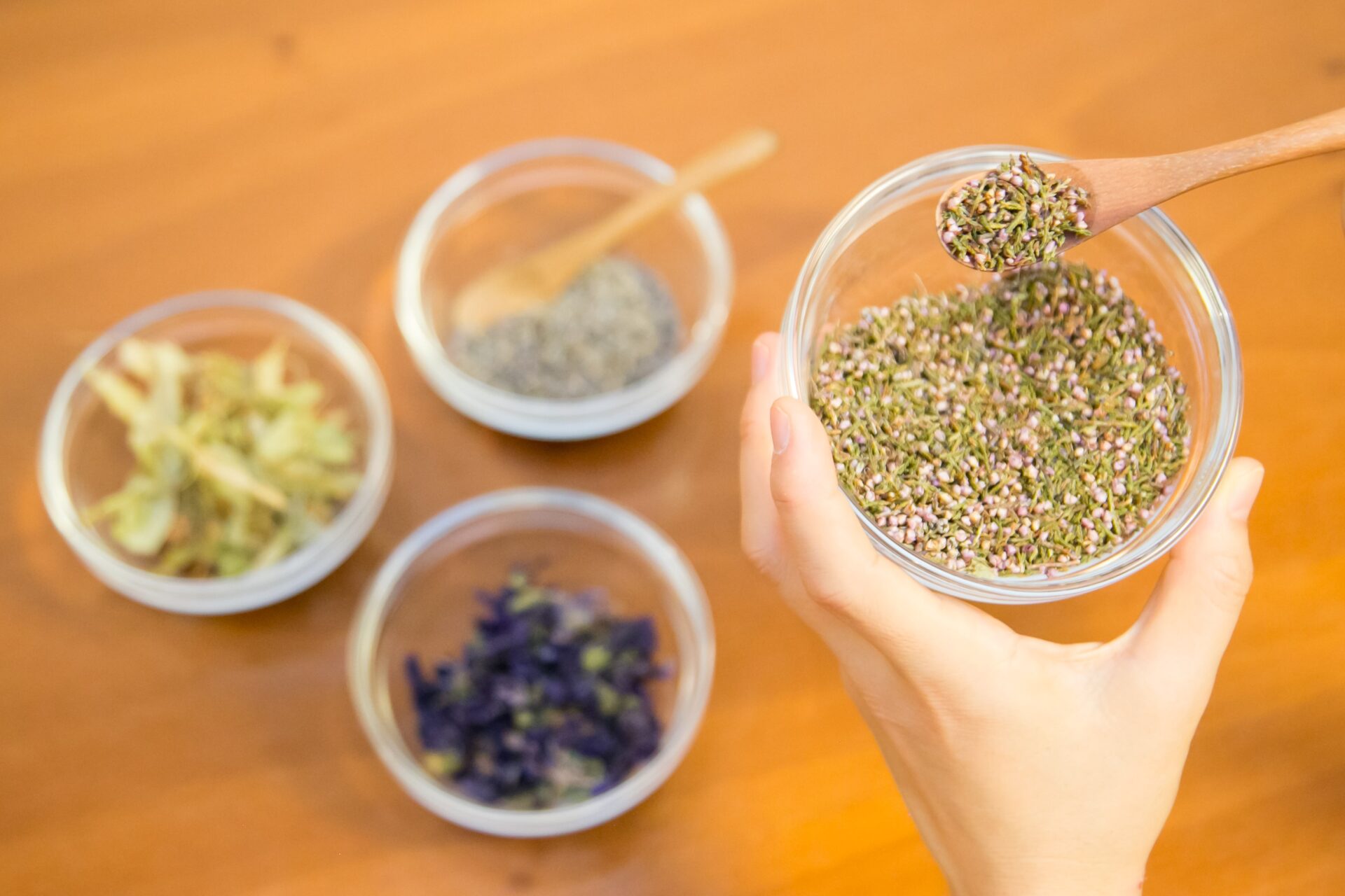 精油が油に溶ける成分(油溶性成分)を抽出したものに対して、ハーブそのものを利用する場合は、お湯を注いで利用します。