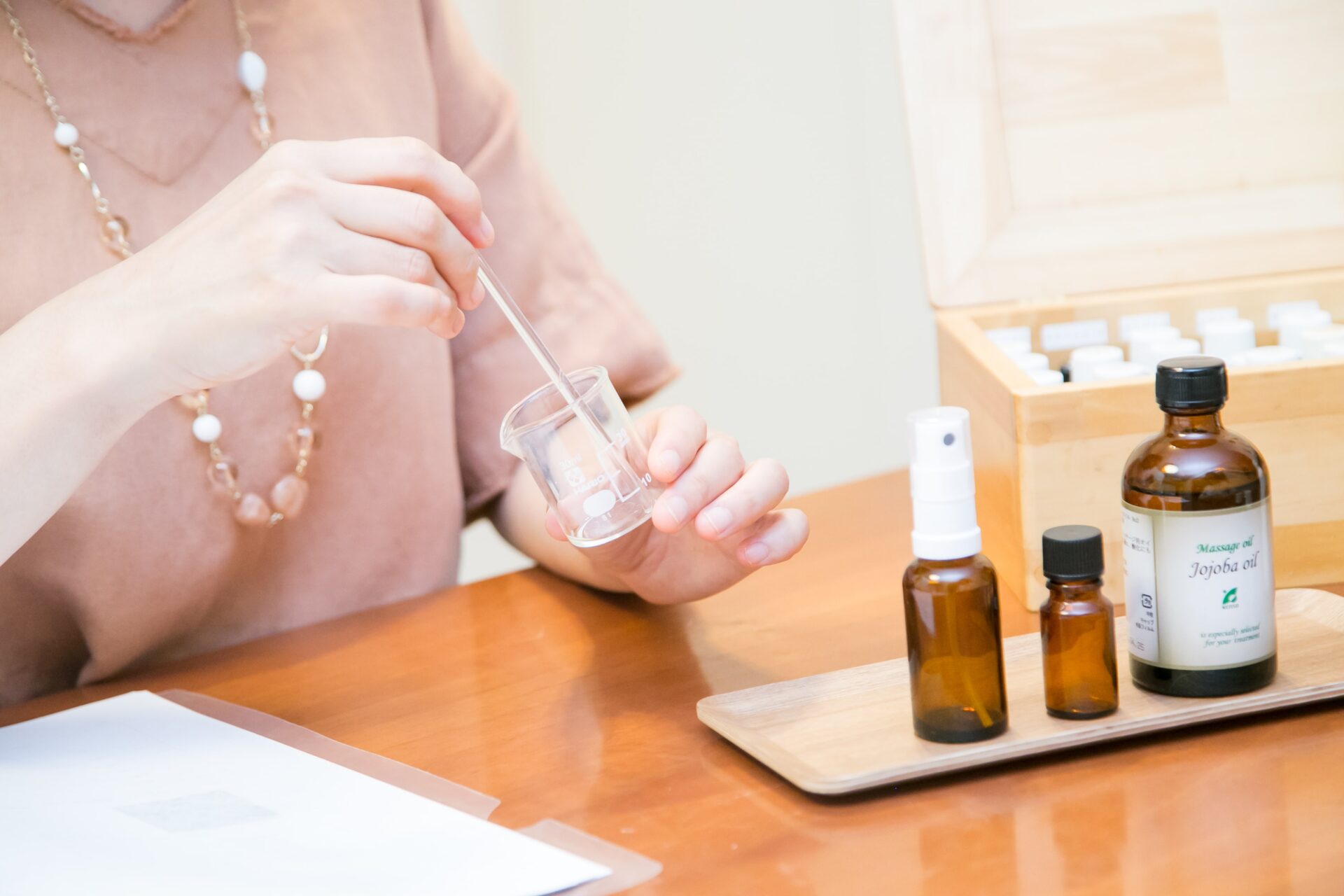 アロマアドバイザー講座のレッスン風景。講師が精油の使い方を丁寧に説明している様子。