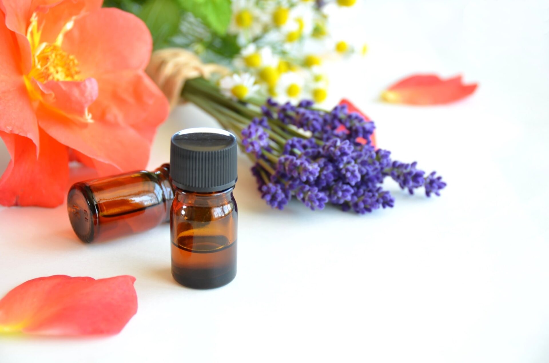 風ら花のメディカルアロマ講座をイメージした精油ボトルとハーブの写真