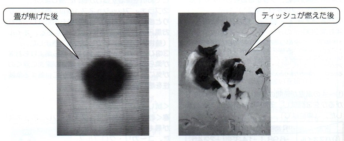 大量のミルラを含んだティッシュを放置した結果、翌朝、ティッシュと畳が焦げて煙が出ていた